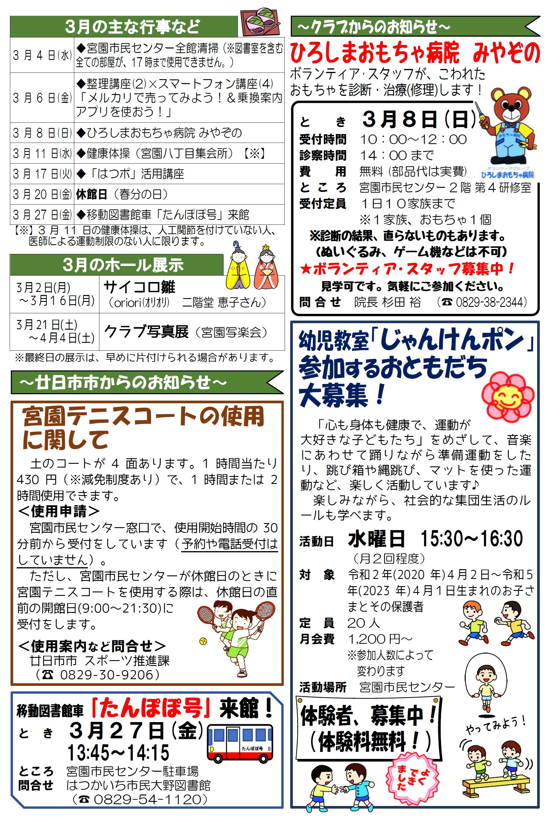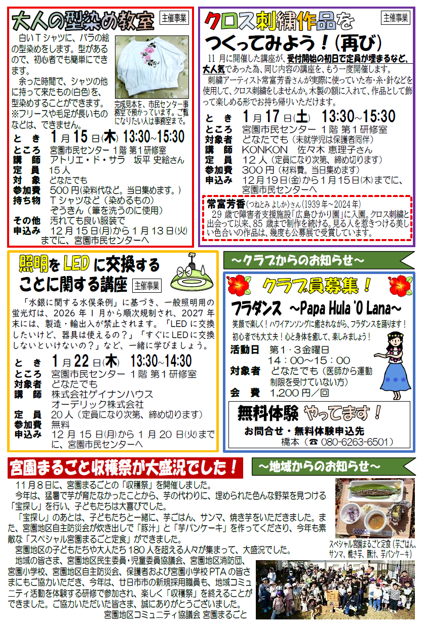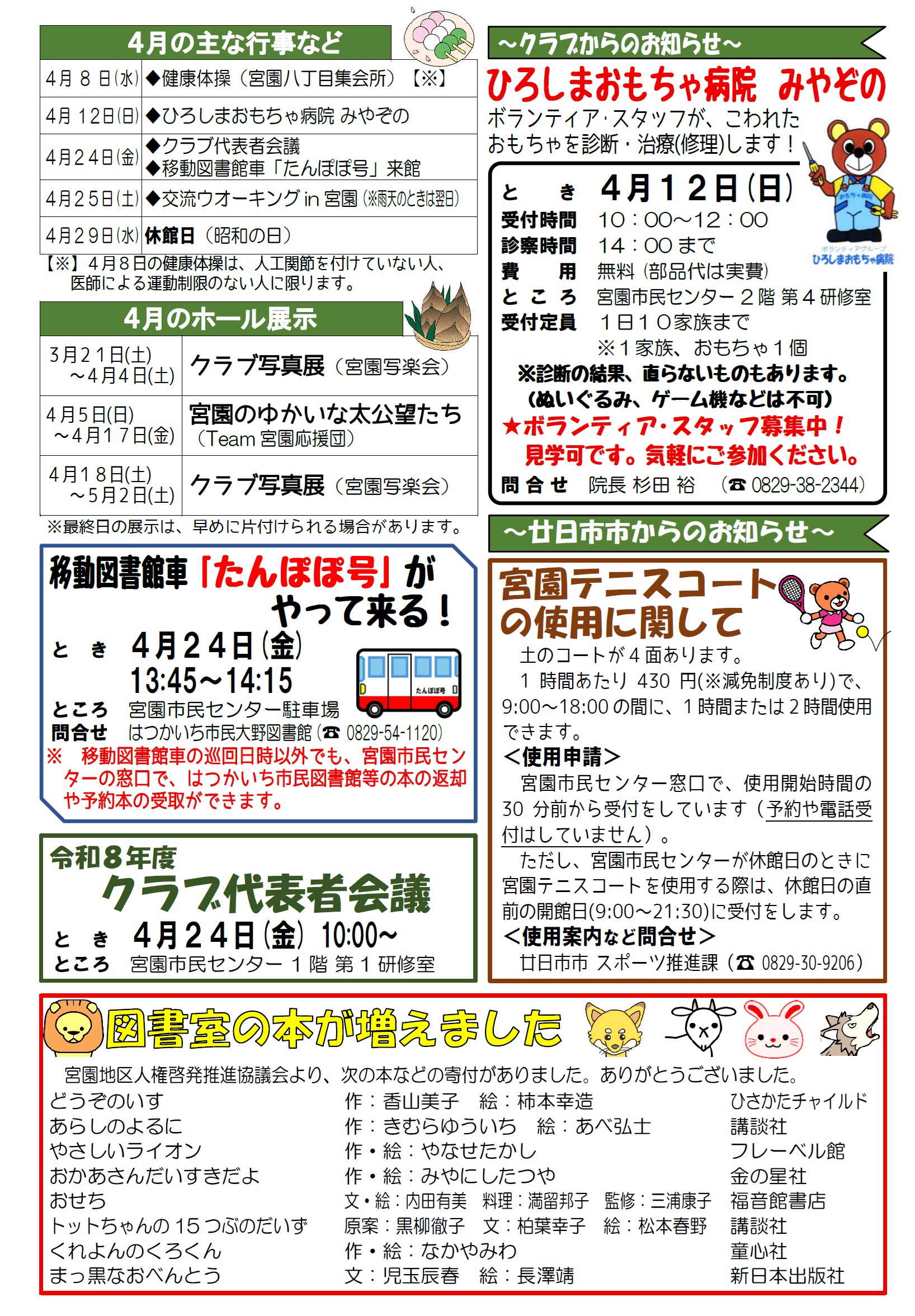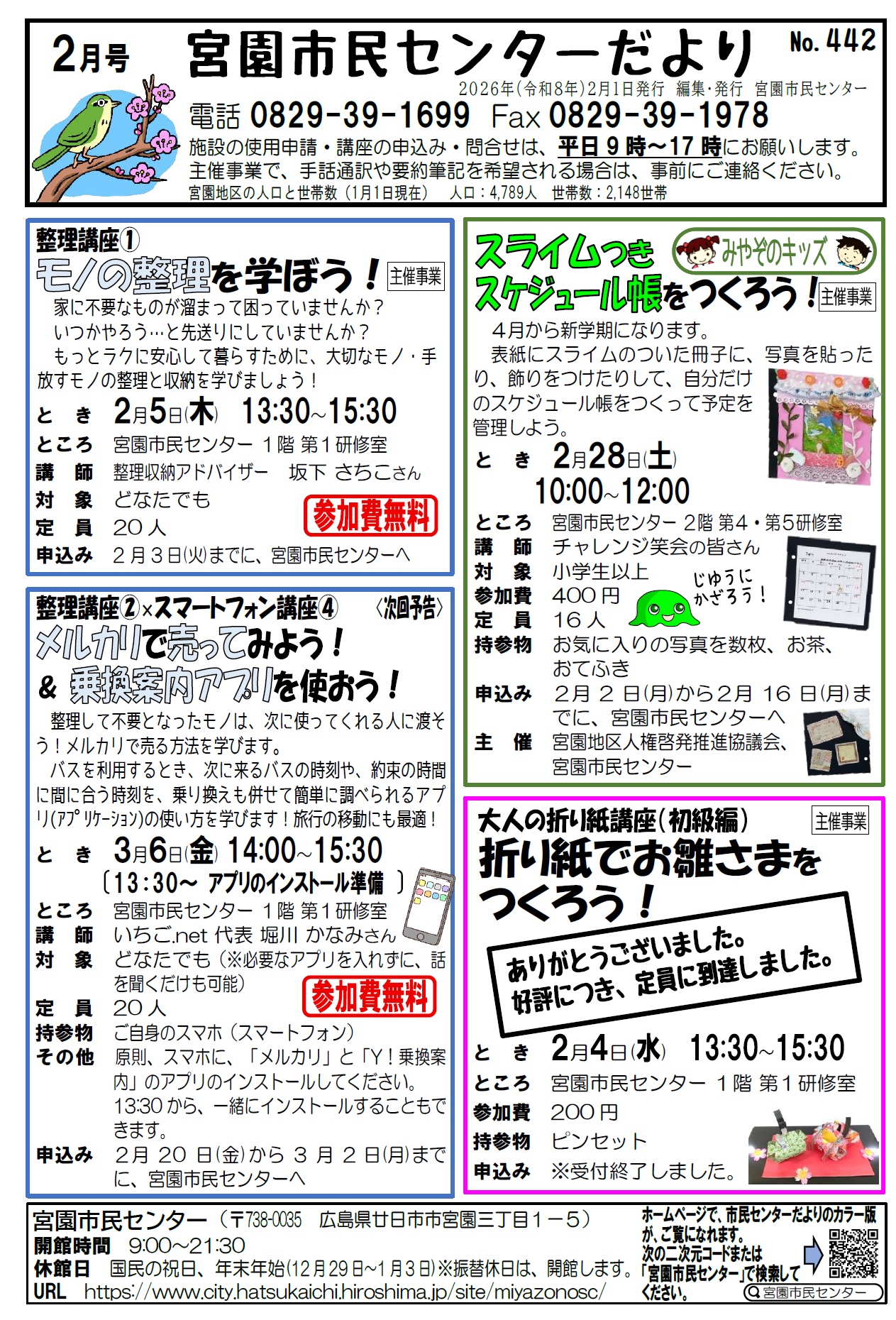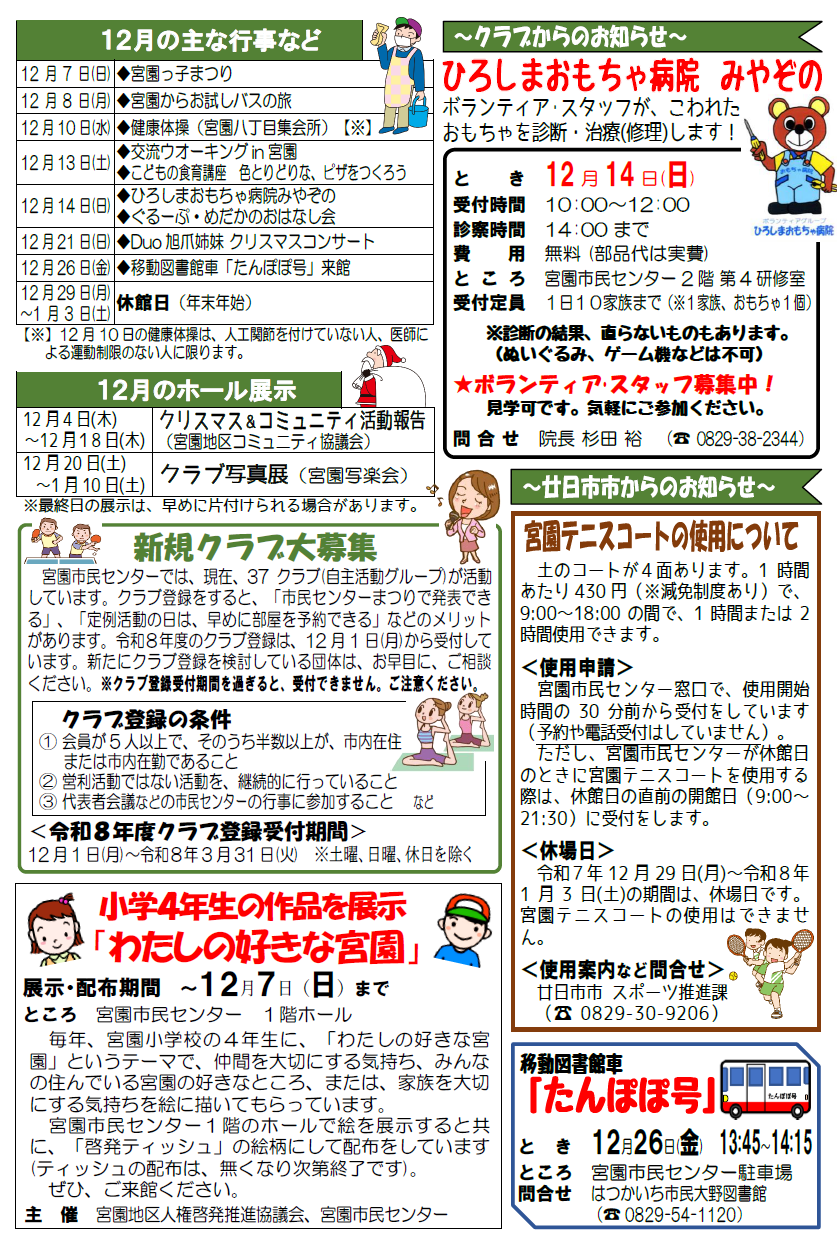 宮園市民センターは、毎月、市民センター行事や地域のことなどを記載した「市民センターだより」を発行しています。