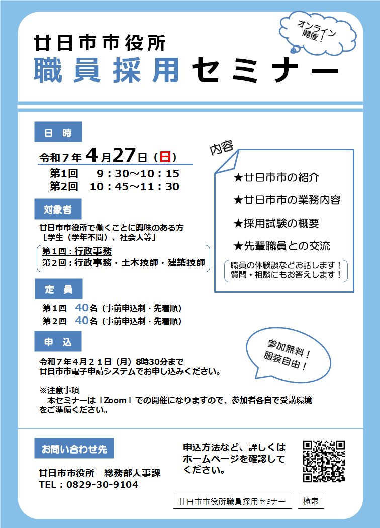 令和7年4月27日(日曜日)に「廿日市市役所職員採用セミナー(事務、土木、建築)」を開催します。